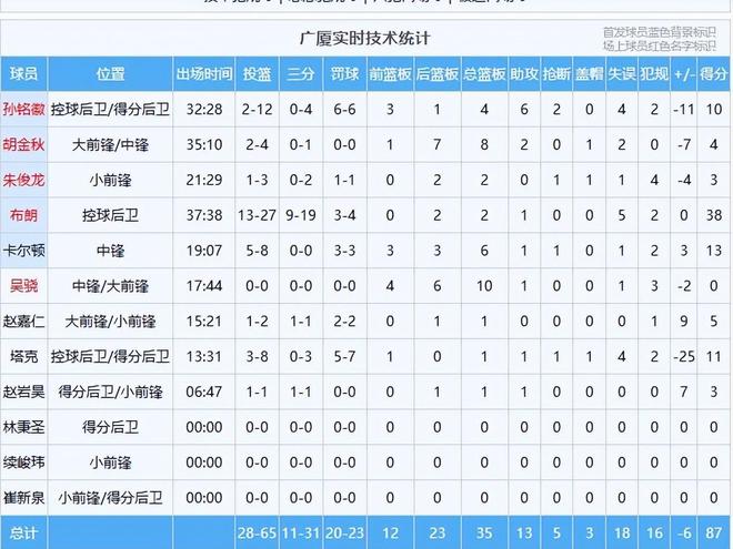 外援布朗在下半場(chǎng)爆發(fā),全場(chǎng)砍下38分,但難以挽回?cái)【郑蜿?duì)另一核心孫銘徽上半場(chǎng)12投僅2中,全場(chǎng)得到10分,內(nèi)線主力胡金秋受困于犯規(guī),僅得到4分和8個(gè)籃板。